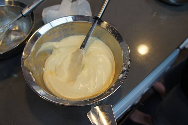 (6). 將打好的蛋白加入(3)、(4)以及馬斯卡澎起司拌勻至滑順,如下圖。