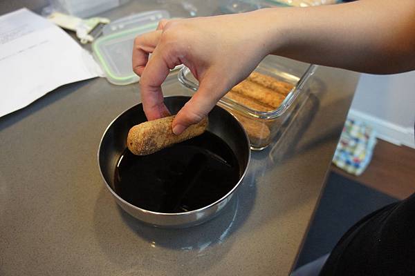 (8). 將(7)倒入淺盤中,取手指餅乾沾酒,排列於裝成品的玻璃碗或杯中 (可用9吋*2吋玻璃烤盤)