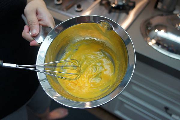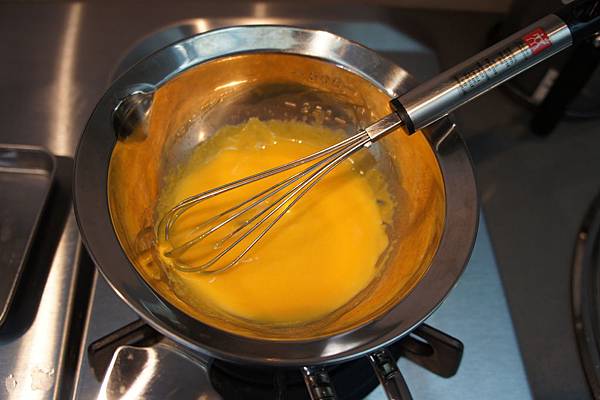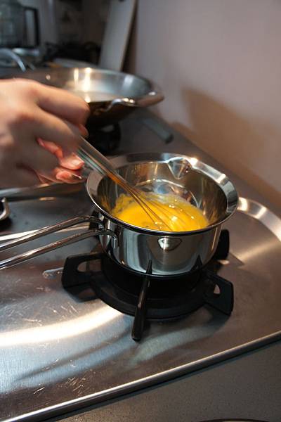 (2). 注意要一直攪拌,不然蛋黃會凝固。