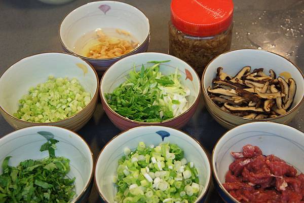 湯頭材料:蝦米(泡軟)、油蔥酥、芹菜(切珠)、蒜苗(切末)、香菇(泡軟切絲)、香菜(切碎)、蔥花、豬肉(切絲用醬油略醃)
