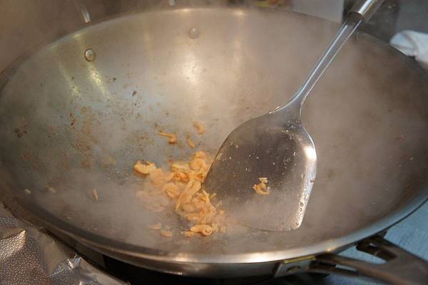 4.千萬不要洗鍋子,繼續下蝦米炒一下。